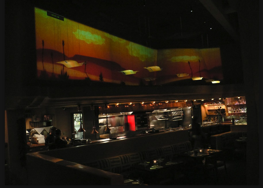 In collaboration with Keep Adding, I animated a 3 channel syncronized HD loop of a 40 minute background animation for the main wall of the restaurant. The playback was done on 3 networked mac minis running a custom quicktime based playback engine to allow for perfectly syncronized playback as well as automatically managed boot and shutdown times. The guys at Keep Adding did the core of the design and the physical install and I created the playback system and the animation.
